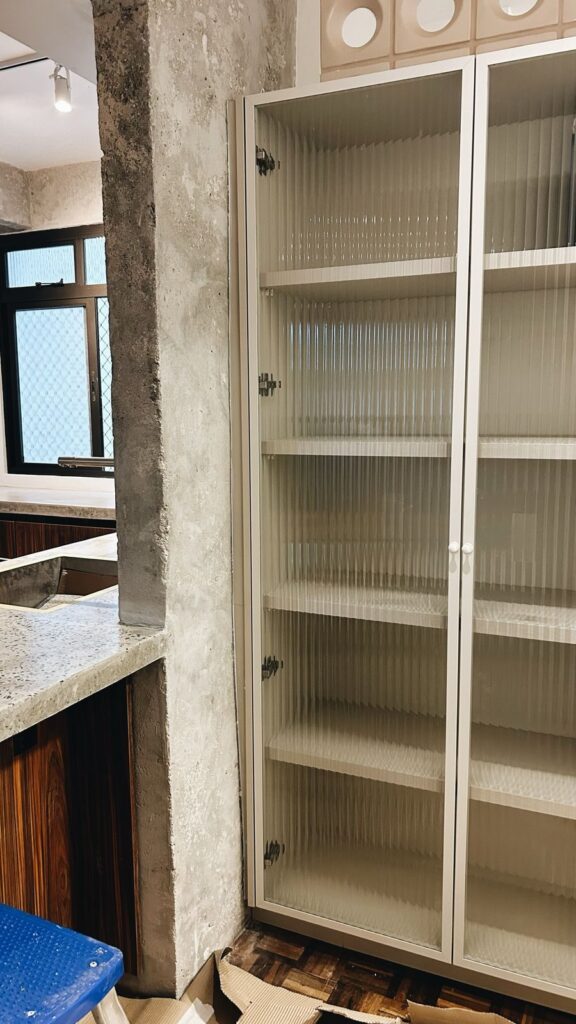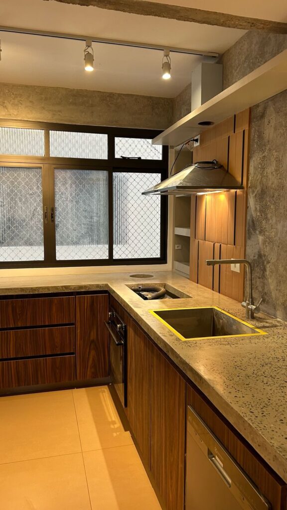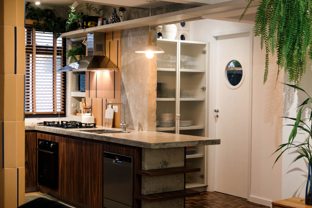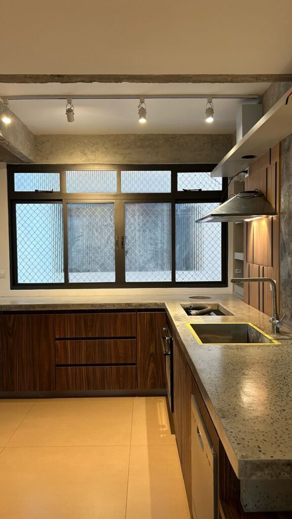 no centro da nova cozinha, a prumada de esgoto do prédio impôs sua presença. em vez de esconder, decidimos evidenciar: usamos o mesmo revestimento das paredes da cozinha e incorporamos esse elemento à composição. a materialidade tem lugar importante neste projeto. moldamos uma bancada de concreto in loco, lixamos vigas e pilares para revelar a estrutura original, e costuramos texturas e cores que traduzem um pouco da personalidade da família.