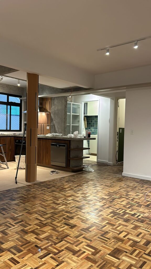 o projeto começou com um gesto claro: abrir os espaços. a cozinha, a lavanderia e os antigos cômodos de serviço foram integrados às salas, trazendo mais luz e ventilação. o apartamento, que originalmente tinha dois acessos — social e de serviço — passou a contar apenas com a entrada principal.